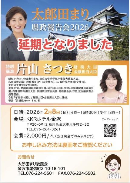 「太郎田まり県政報告会2026」延期のお知らせ